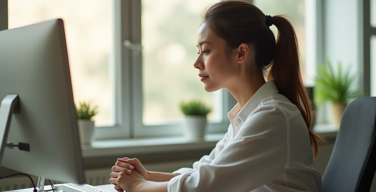 Les tensions ne s’accumulent pas seulement dans le bas du dos. La concentration intense, le stress des visioconférences et la posture figée devant l’écran crispent insidieusement la zone des trapèzes et des cervicales. Heureusement, quelques micro-mouvements, réalisables en toute discrétion sur votre chaise, suffisent à dissiper ces nœuds avant qu’ils ne deviennent douloureux.
